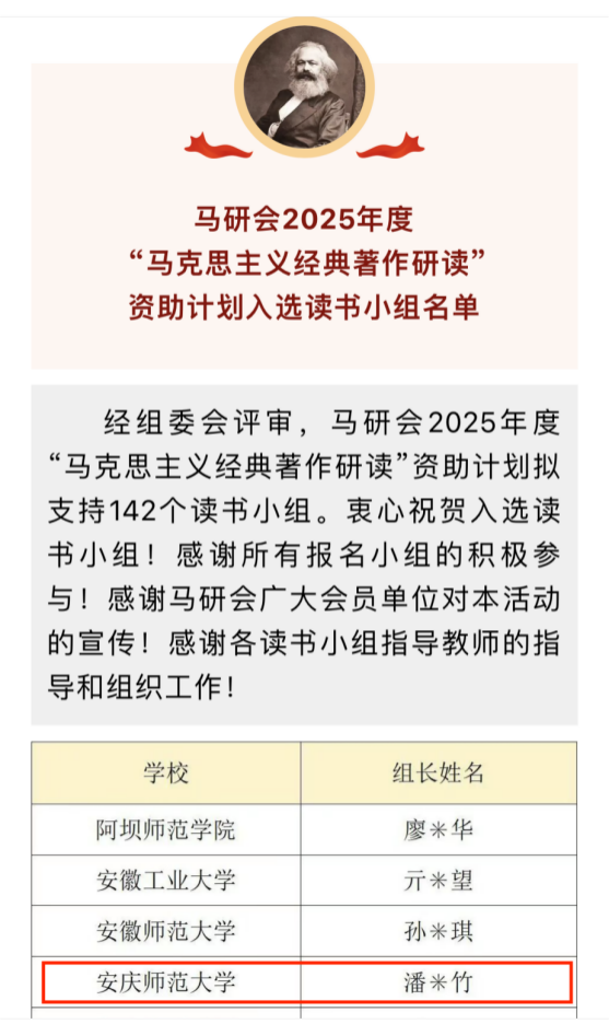 10月19日,中国高等教育学会马克思主义研究分会公布2025年度“马克思主义经典著作研读”资助计划评选结果,学院“稼先”读书小组成功入选,这是马克思主义学院连续四年获此殊荣。