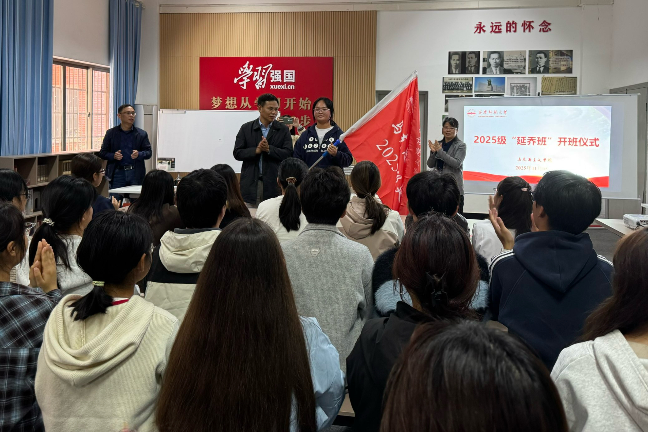 开班典礼在庄严的国歌中拉开帷幕。潘锦云对思想政治教育专业“延乔班”的顺利开班表示祝贺。他寄语延乔班学子,希望大家始终保持警醒与自觉,找准自身定位,胸怀远大志向,以端正的态度和饱满的热情投入学习。他指出,“延乔班”学子不仅承载着个人的理想追求,更肩负着传承学校精神、展现时代青年风采的责任,希望同学们珍惜宝贵的学习机会,不负学校的倾力培养与殷切期望。典礼现场,潘锦云为思想政治教育专业2025级“延乔班”授旗。