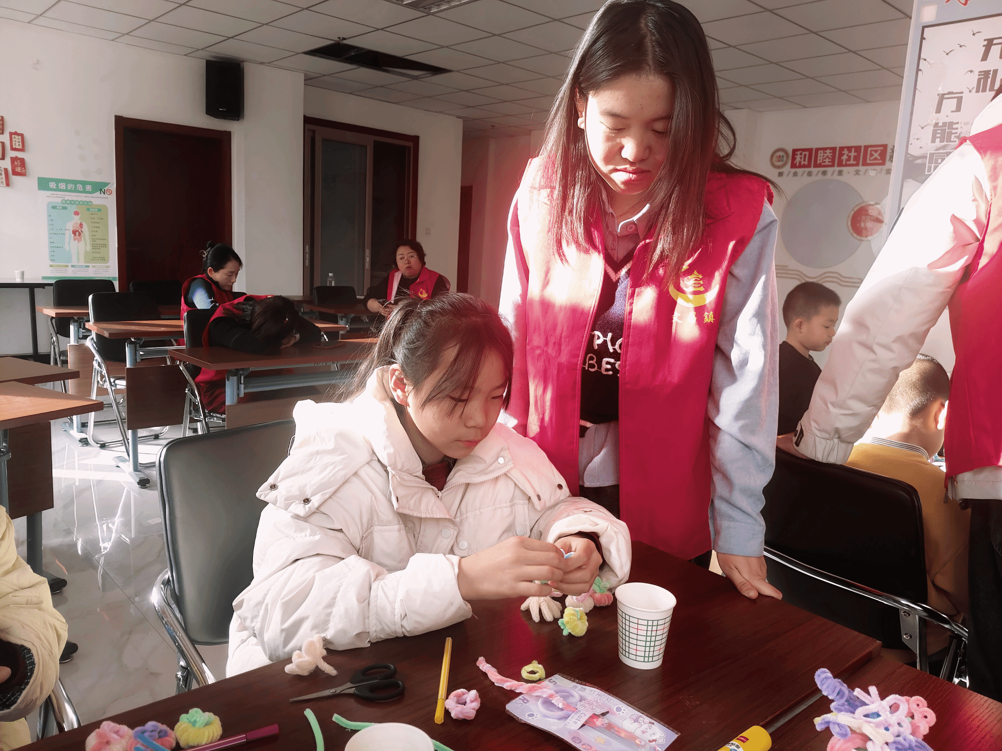 思想政治教育专业2024级(2)班张银怀揣着志愿服务的热忱,在家乡以社区志愿者的身份参加了社会实践活动。在社区“睦邻小课堂”的志愿服务中,她化身“暖心陪伴者”与“知识传播者”为孩子们开展课业辅导,耐心解答作业难题,看着紧锁的眉头渐渐舒展,一声声清脆的“谢谢姐姐”让志愿服务的意义愈发真切。除了学业辅导,她还带着孩子们用扭扭棒、彩纸创作手工作品,让艺术点亮课堂;用趣味动画和通俗语言开展食品安全科普,让健康知识的种子在童心萌芽;在书法课上,与孩子们一同握笔运笔、临摹经典,在一撇一捺中感受中华优秀传统文化的温度,让陪伴成为连接彼此的温暖纽带。